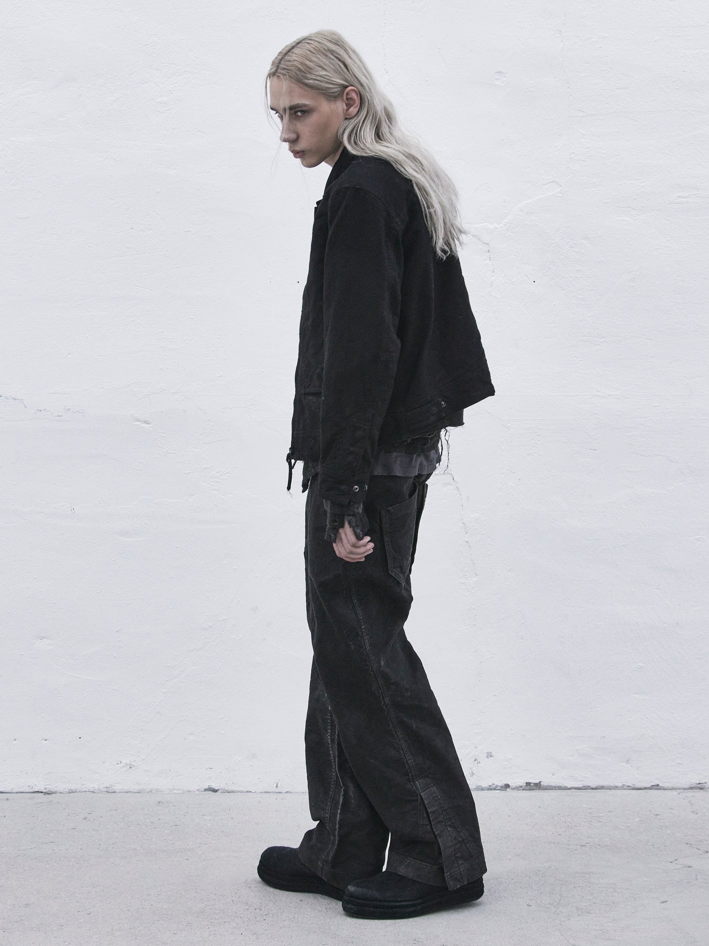 레귤러 핏, 크롭 기장, 뒷면이 들린 밑단 실루엣