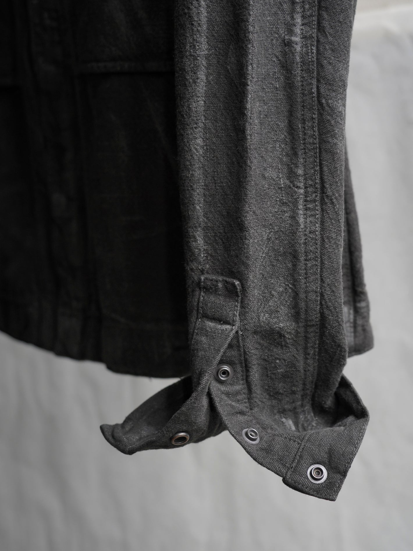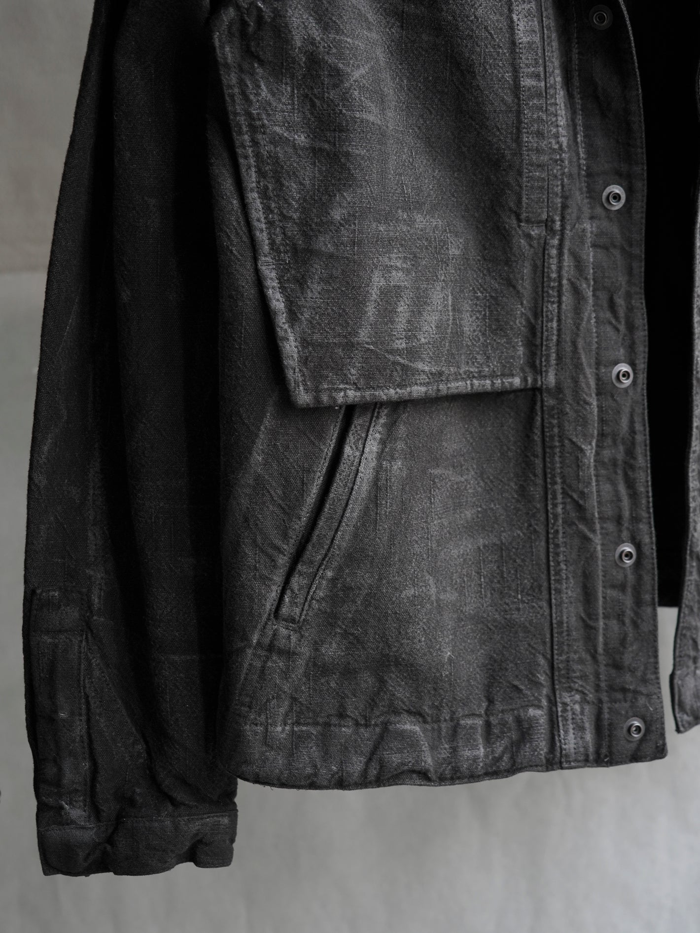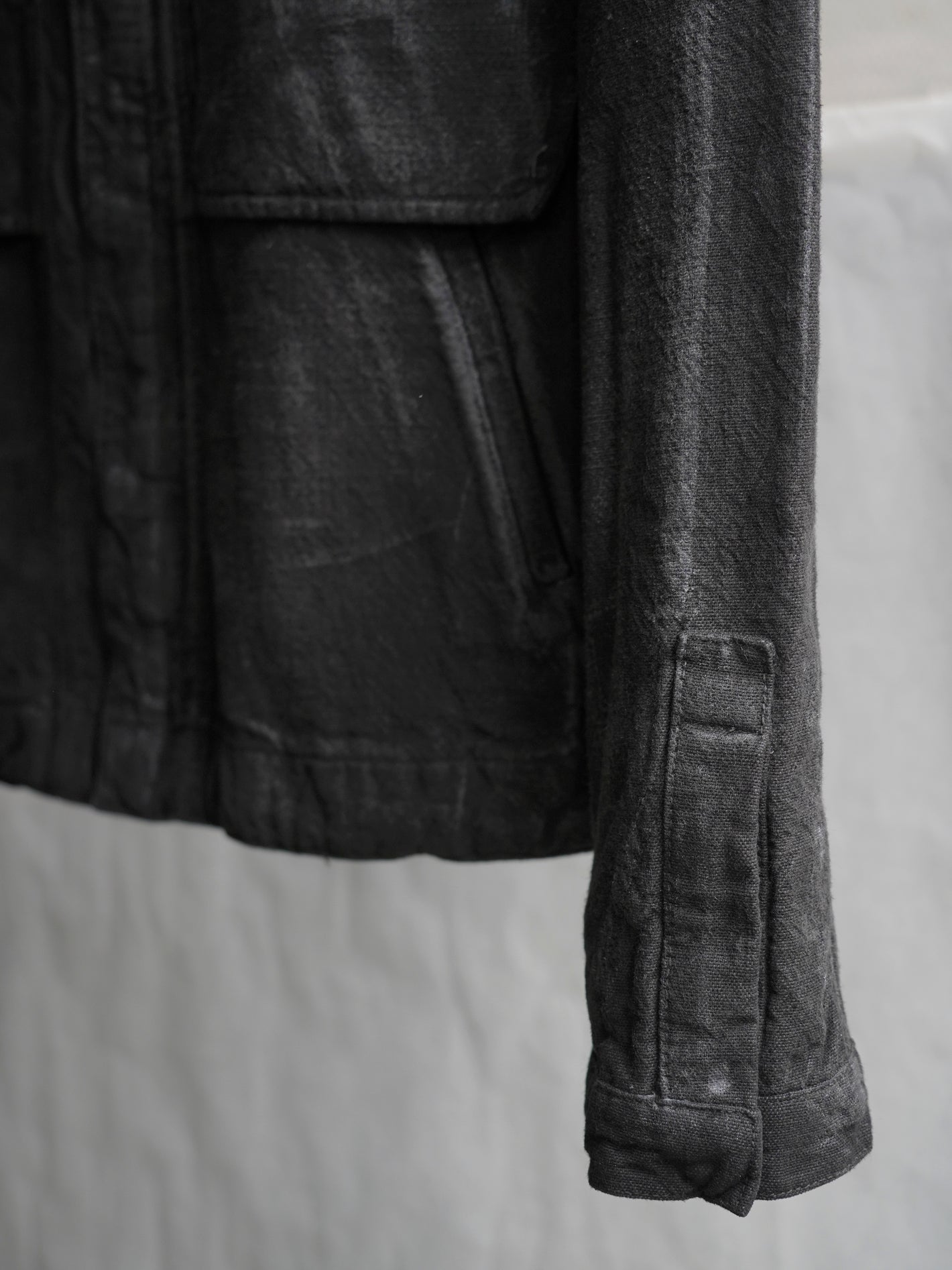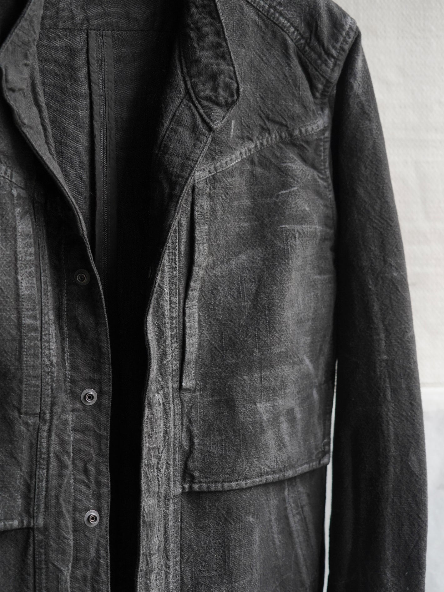 재봉 후, 추가적인 피그먼트 가먼트 다잉과 핸드 왁스 처리로 이러한 특징들을 더욱 강조.