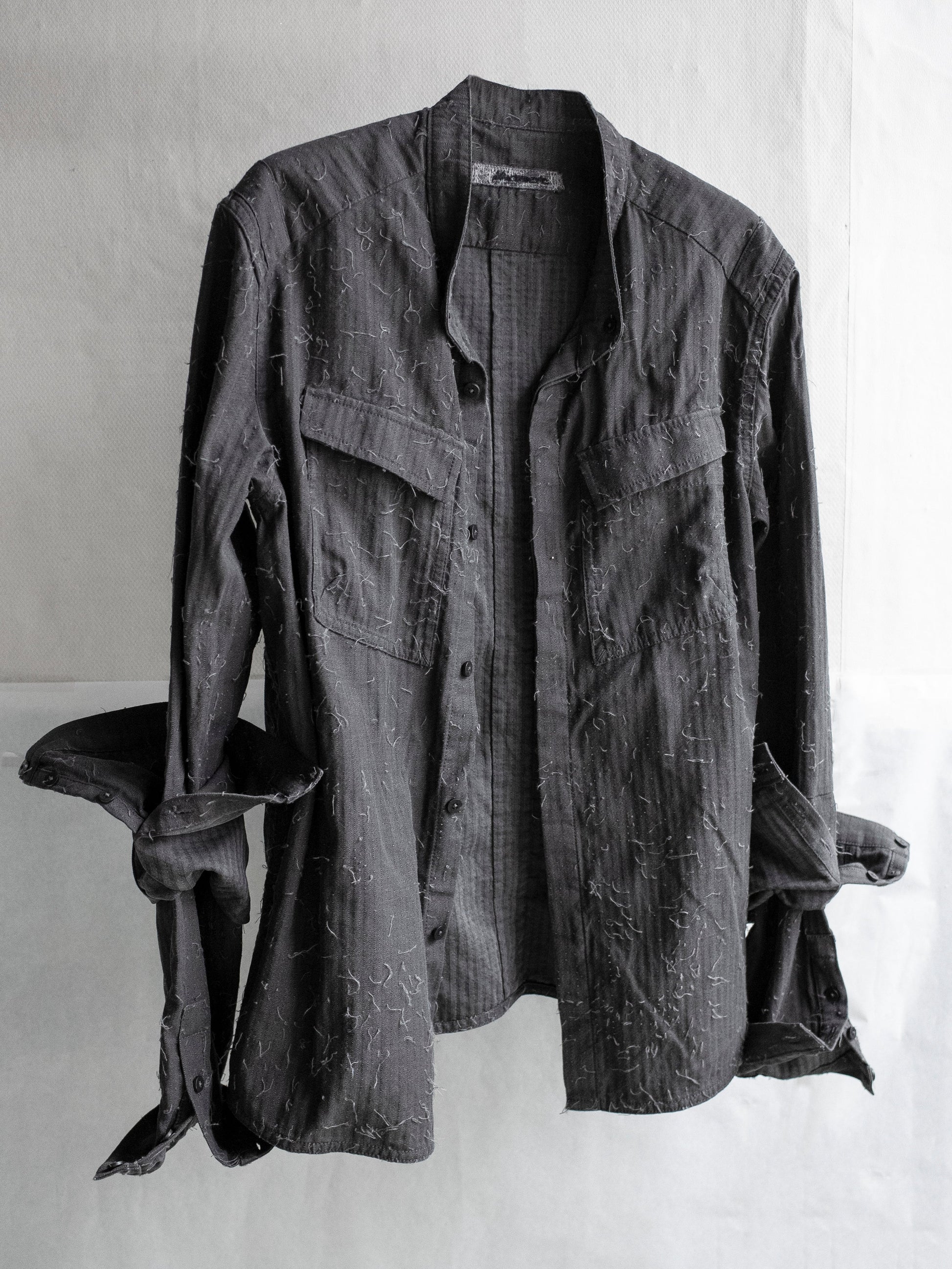 원단 겹의 사이를 연결하던 실의 흔적이 남아있는 표면