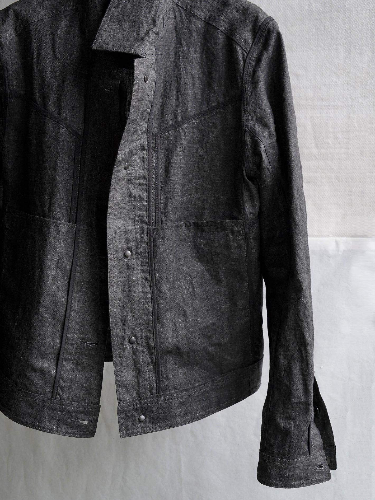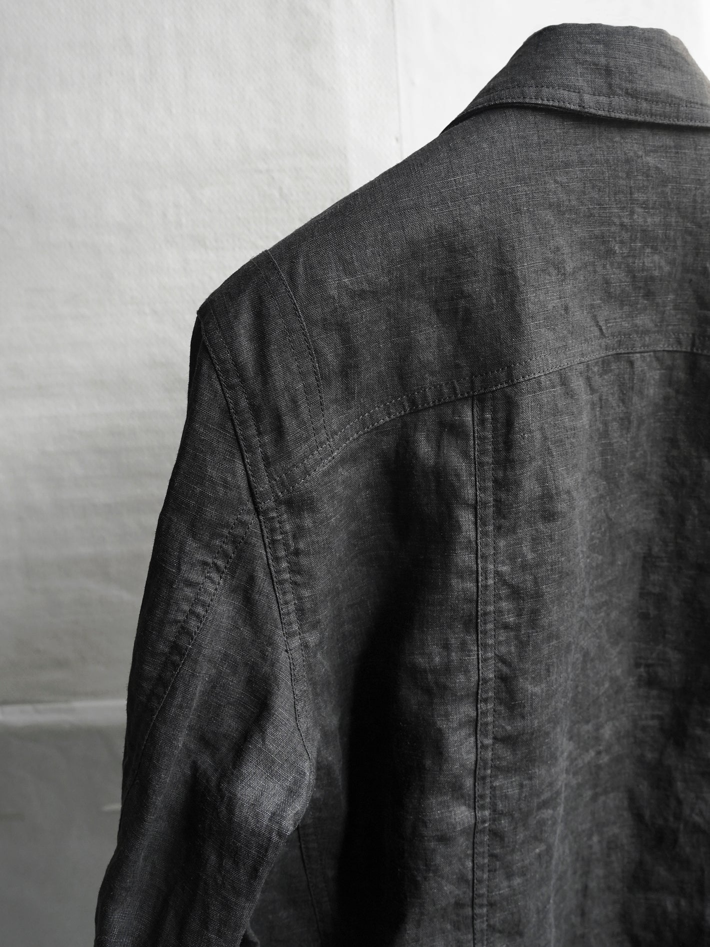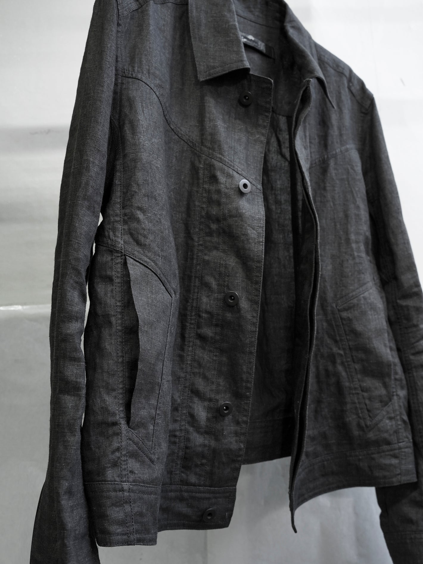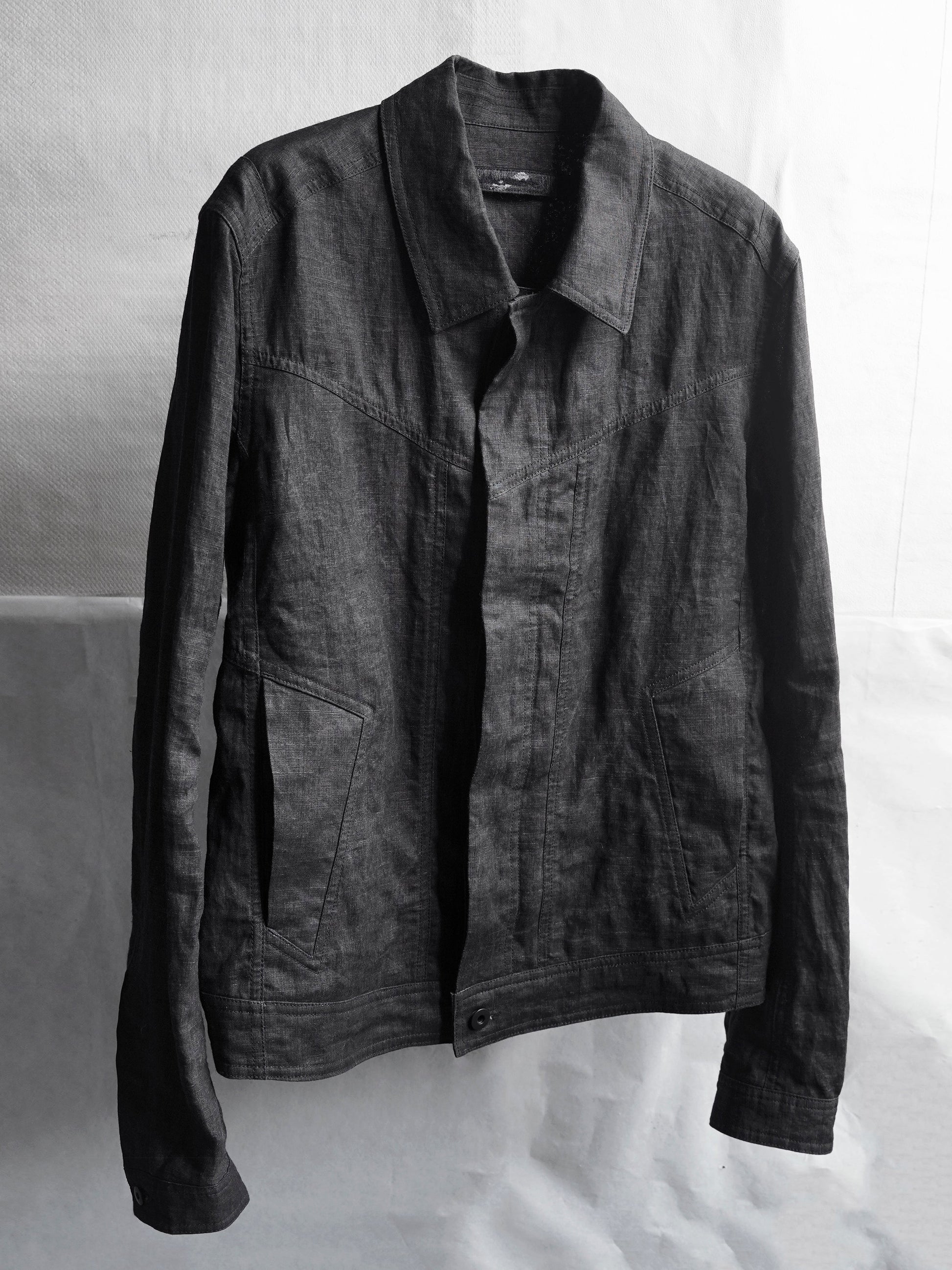 가벼운 중량감의 잉크 코팅된 flax 소재의 트러커 자켓