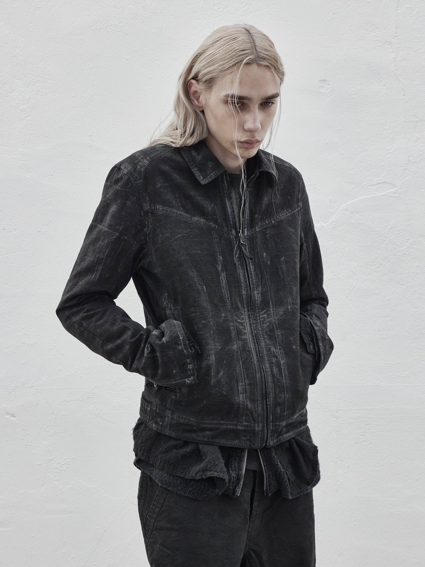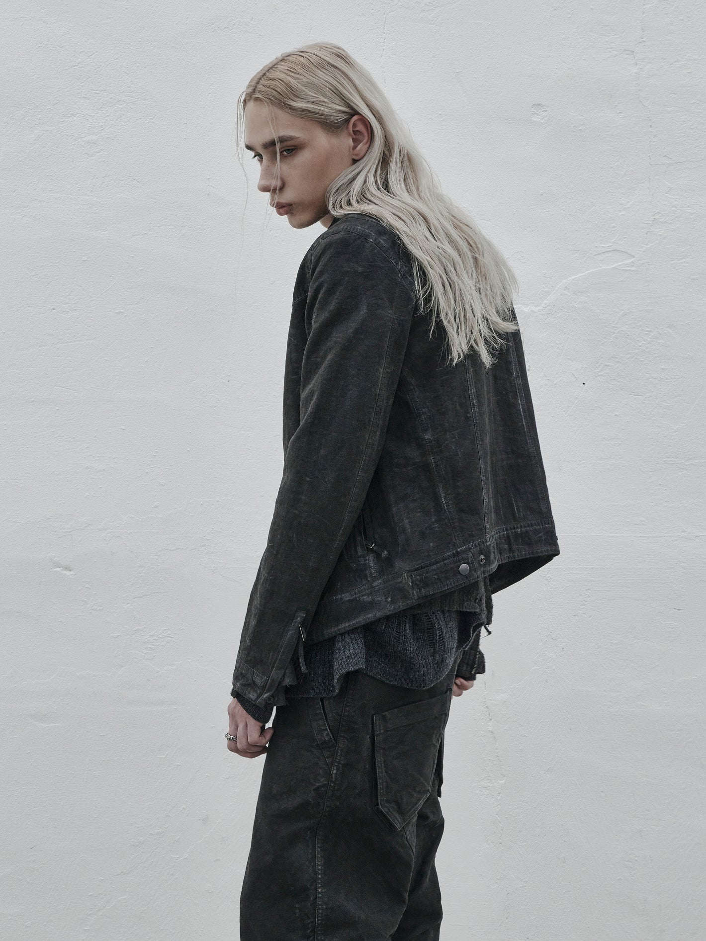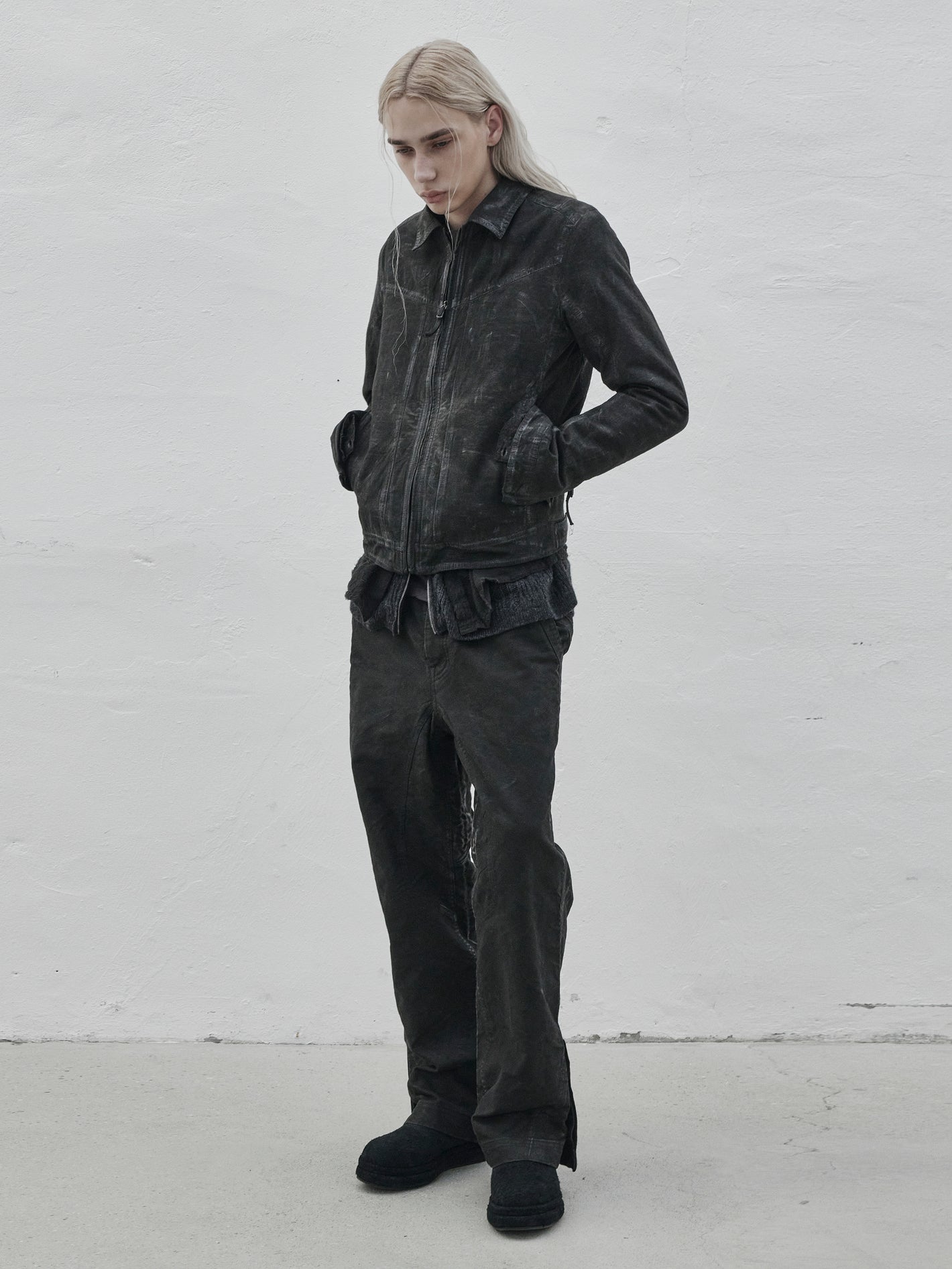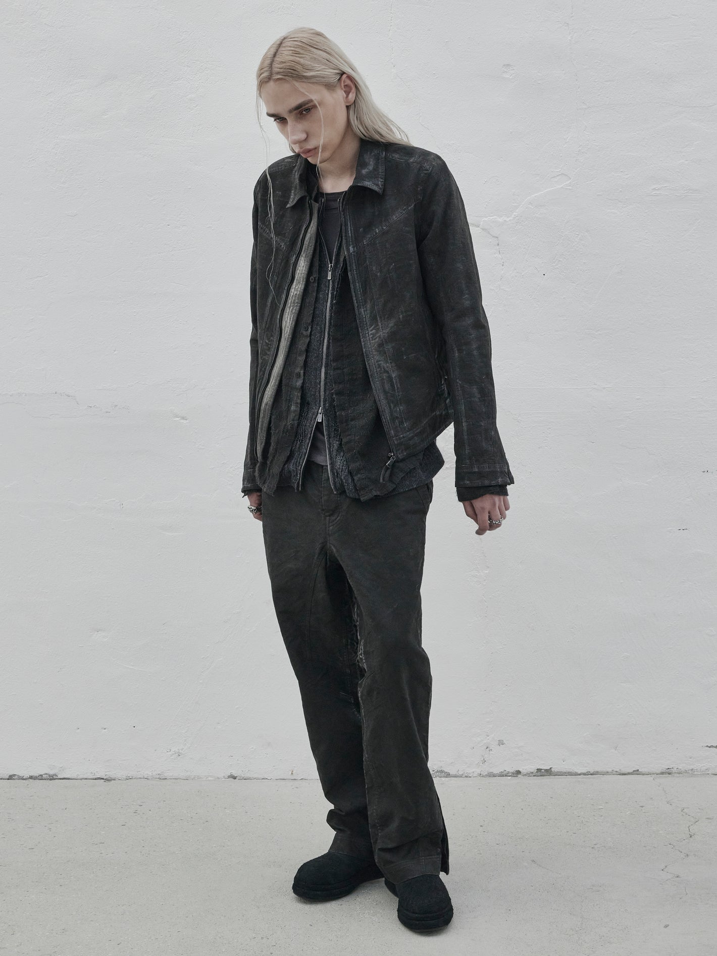 재봉 후, 추가적인 피그먼트 가먼트 다잉과 핸드 왁스 처리로 이러한 특징들을 더욱 강조.